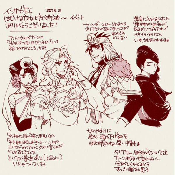 推しが揃って出てるよって耳にしたので急いで見にいった(インサガECはタリアさんが出てるイベントだけやるログイン勢です ちょこっと育ててるのはサガスカ勢だけ)